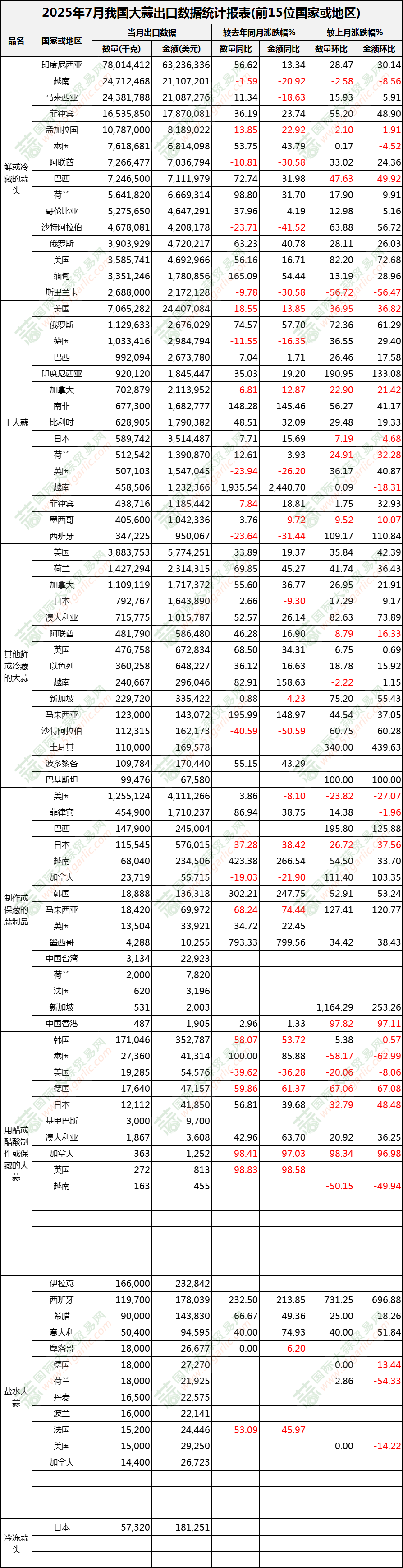 2025年7月大蒜出口數(shù)據(jù)(按國家)