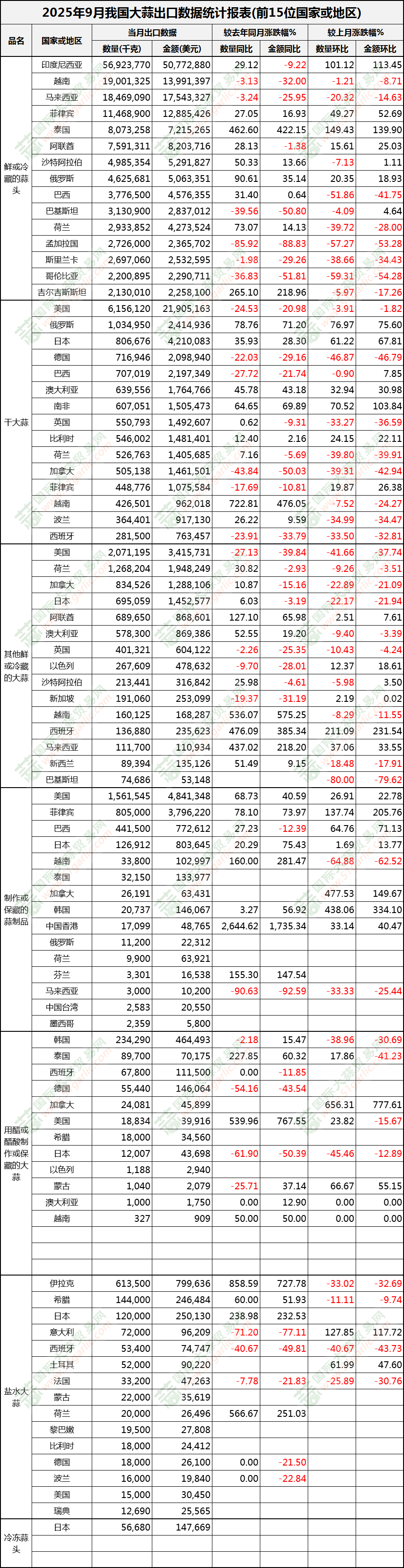 2025年9月大蒜出口數(shù)據(jù)(按國家)