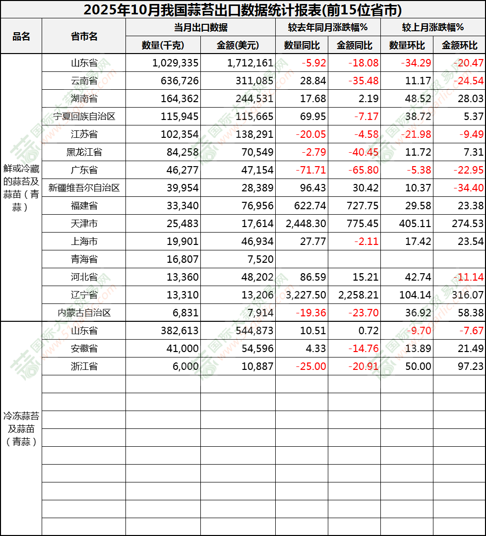 2025年10月蒜苔出口數(shù)據(jù)(按省市)