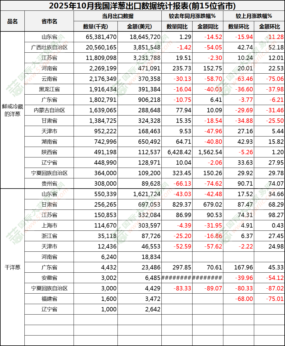 2025年10月洋蔥出口數(shù)據(jù)(按省市)