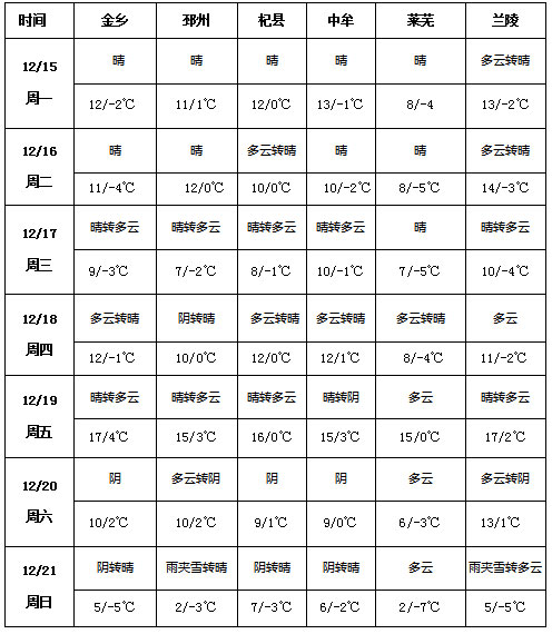 未來一周(12.15-12.21)大蒜主產區(qū)(金鄉(xiāng)、邳州等)天氣以晴或晴轉多云為主,僅 12.21 邳州、蘭陵可能出現雨夾雪天氣。與上周相比,周內氣溫開啟大規(guī)?;嘏J?,周五之前氣溫逐步回升,周內金鄉(xiāng)最高 17℃,周六之后,產區(qū)氣溫再度回落,金鄉(xiāng)最低溫達- 5℃。降水方面僅周末局部產區(qū)將出現雨夾雪,整體降水稀少。